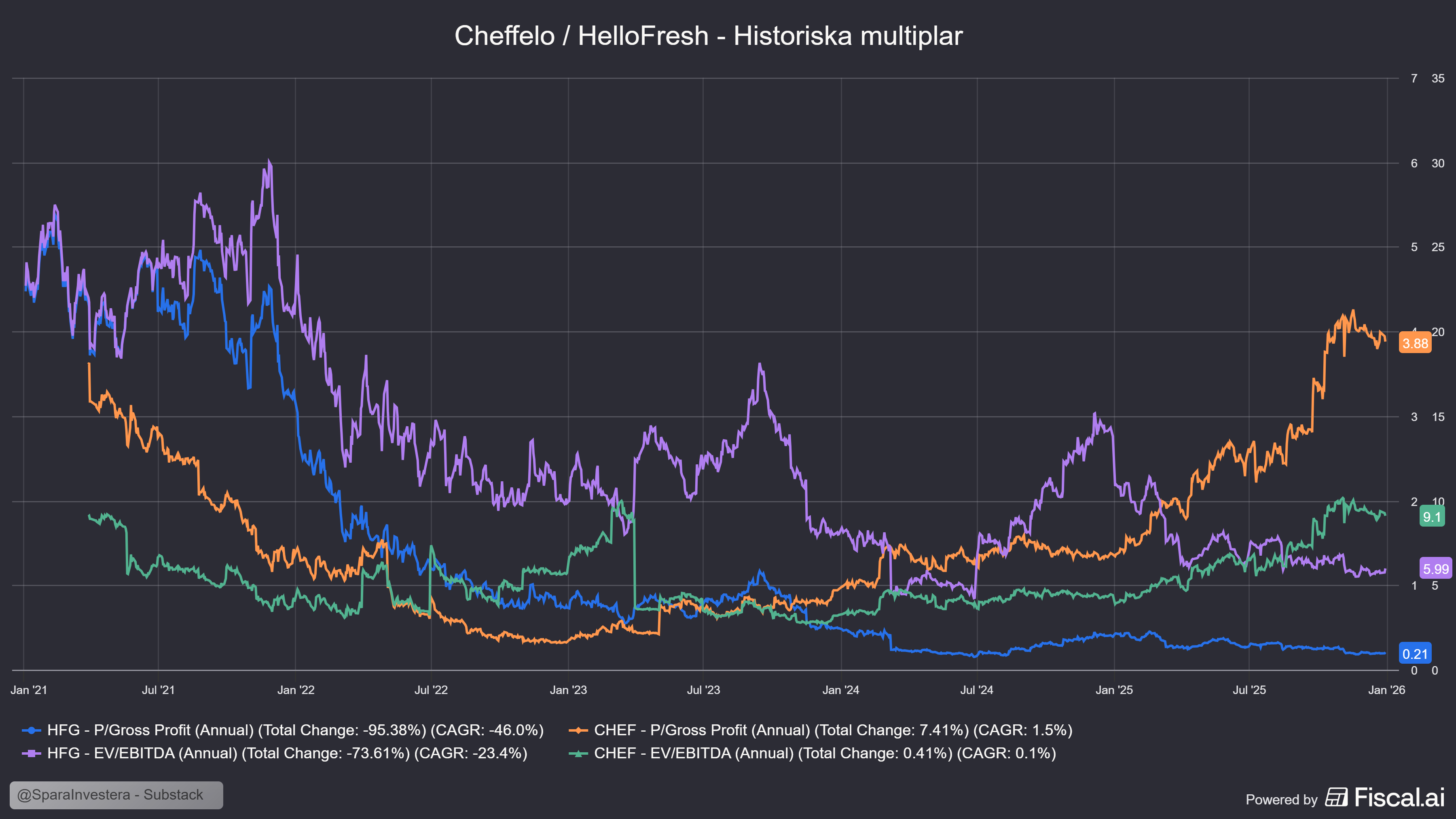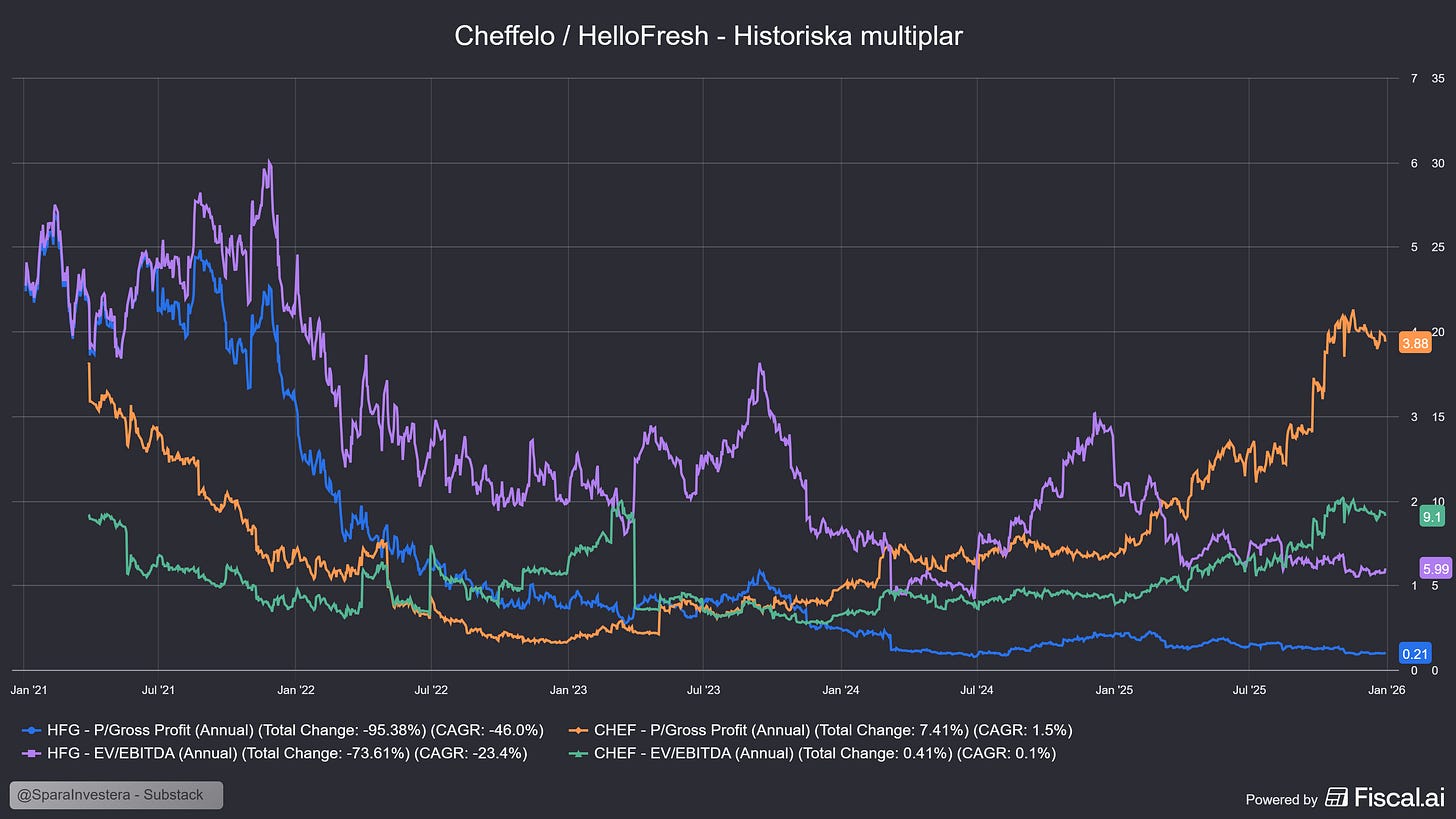 HelloFresh värderas i praktiken som ett bolag i kris. Med ett EV/Sales på endast 0,12x handlas bolaget nu till sin lägsta värdering någonsin efter raset den 12 februari.