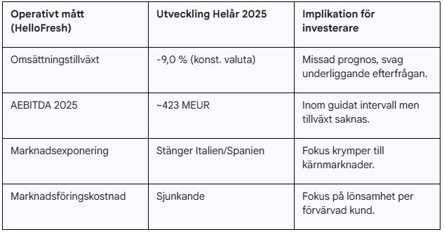 Efter beskedet den 12 februari 2026 står det klart att HelloFreshs transformation är betydligt svårare än marknaden anat. Bolaget missade sina egna intäktsmål för 2025 och varnar för att efterfrågan fortsätter att vika under början av 2026. Aktien rasade över 10 % på Frankfurtbörsen omedelbart efter nyheten.